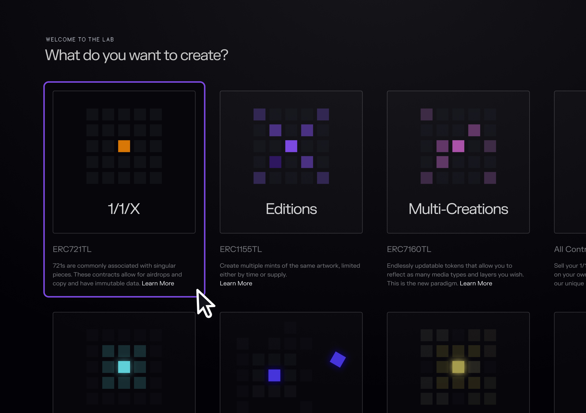 Exploration: This carousel layout surfaced all available contract types visually, allowing artists to see what they could create -- editions, collections, dynamic pieces, and more. Each tile acted as a gateway into a distinct creative pathway, with clear labels and motion-driven feedback using Rive. The goal was to make contract selection feel intuitive and inspiring, not technical.