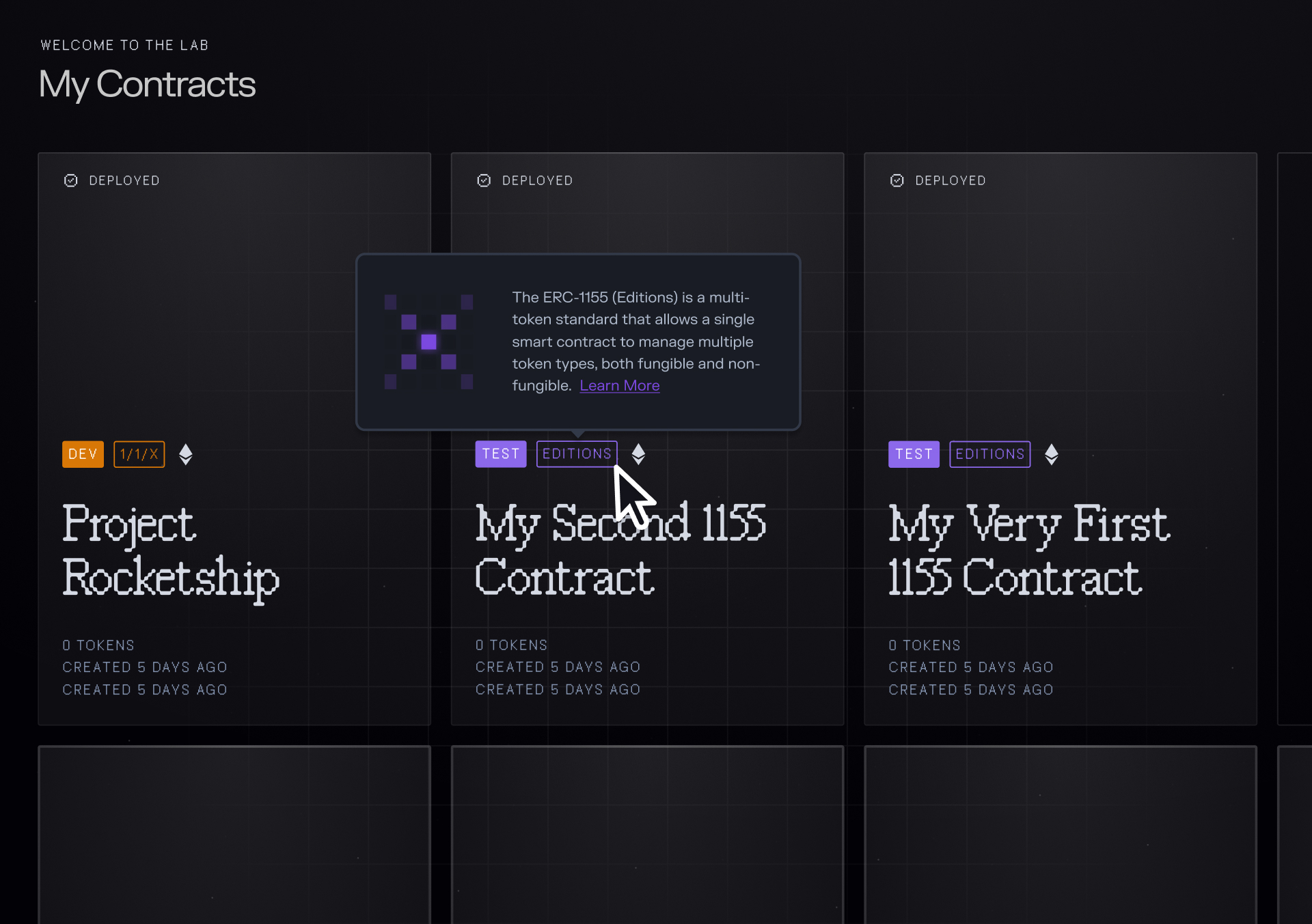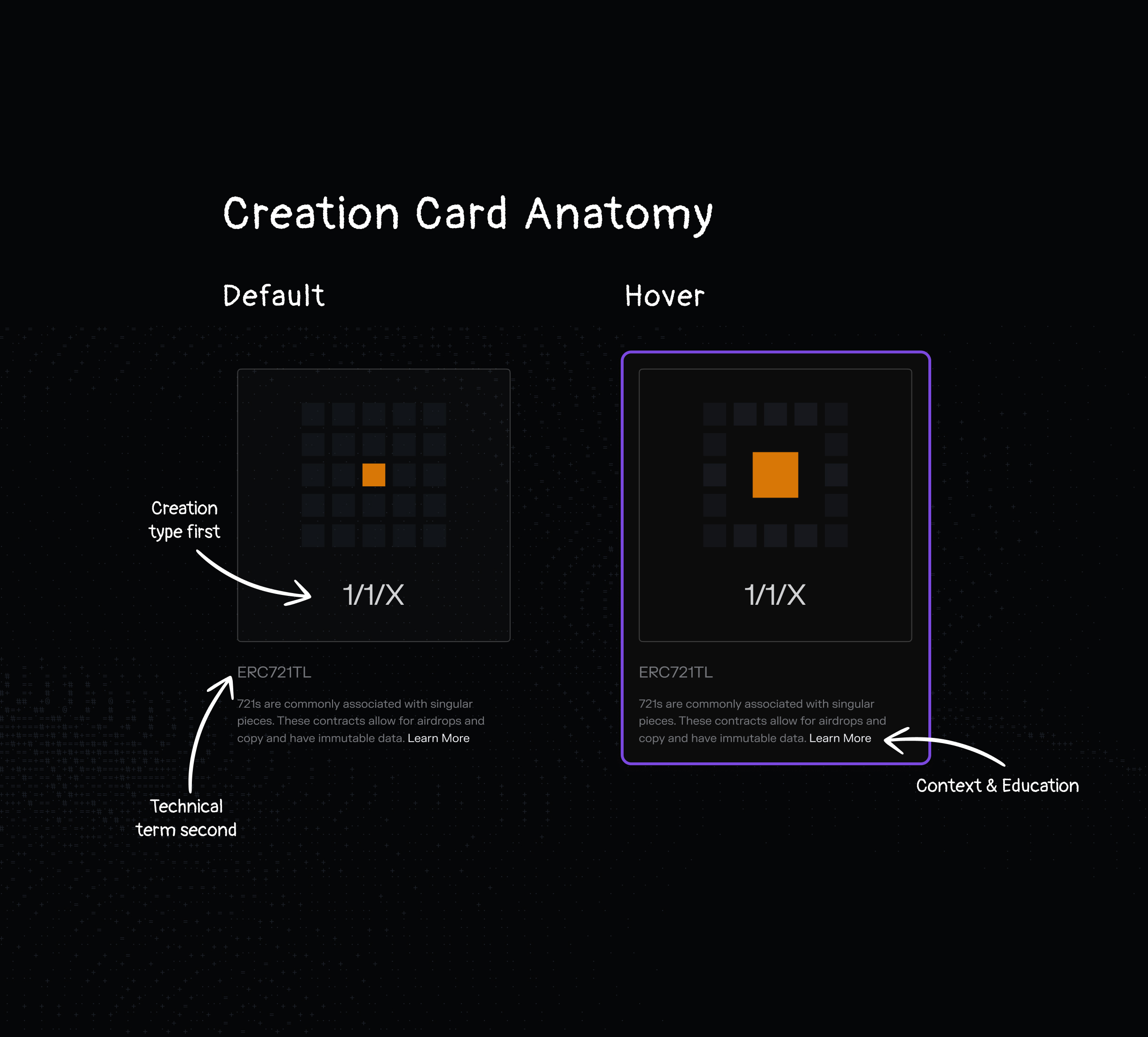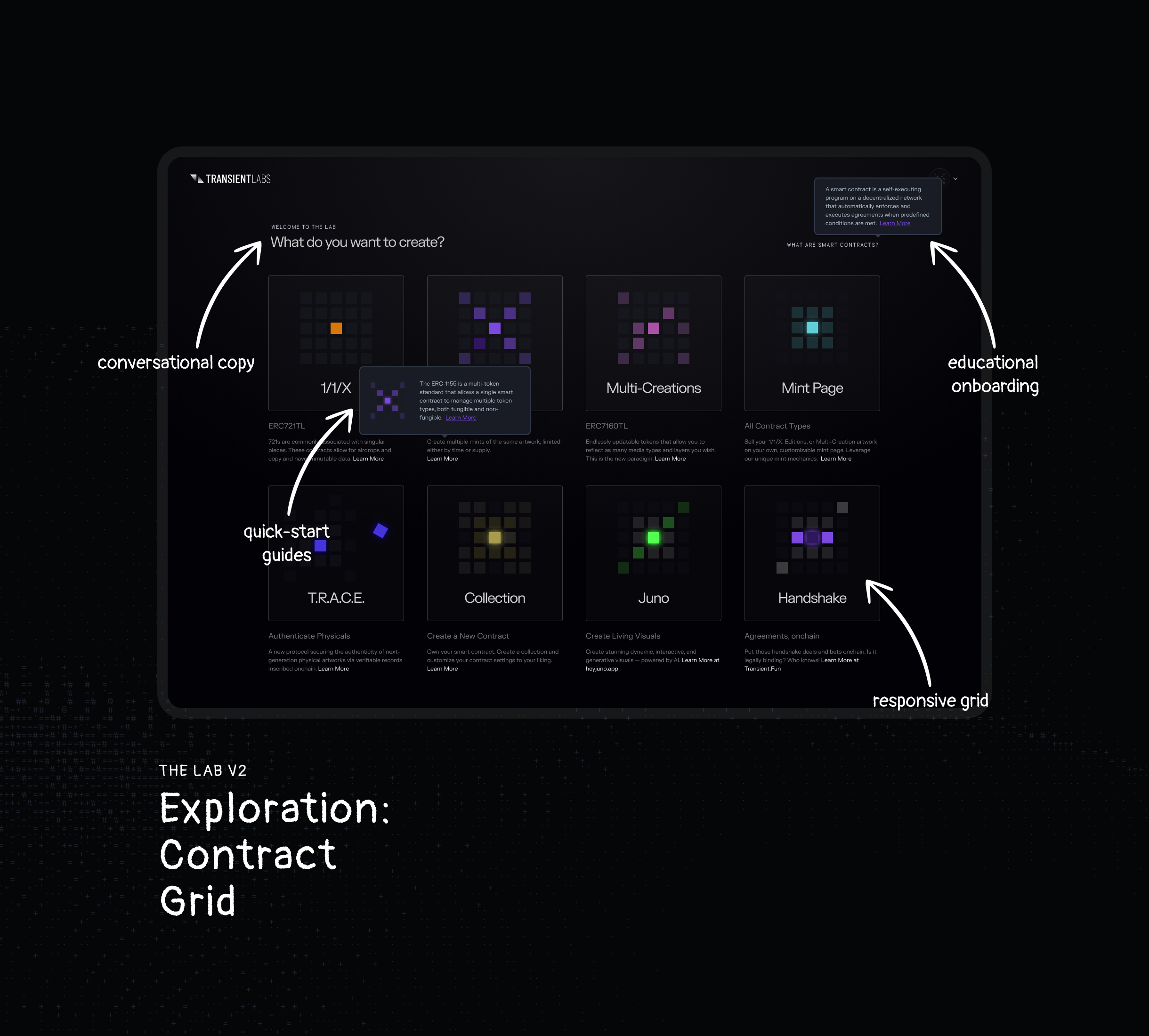 To make The Lab more accessible for first-time users, I designed lightweight educational tips directly into the interface. These contextual tooltips explained blockchain concepts, contract types, and minting terminology right where users encountered them, reducing friction without overwhelming the experience.